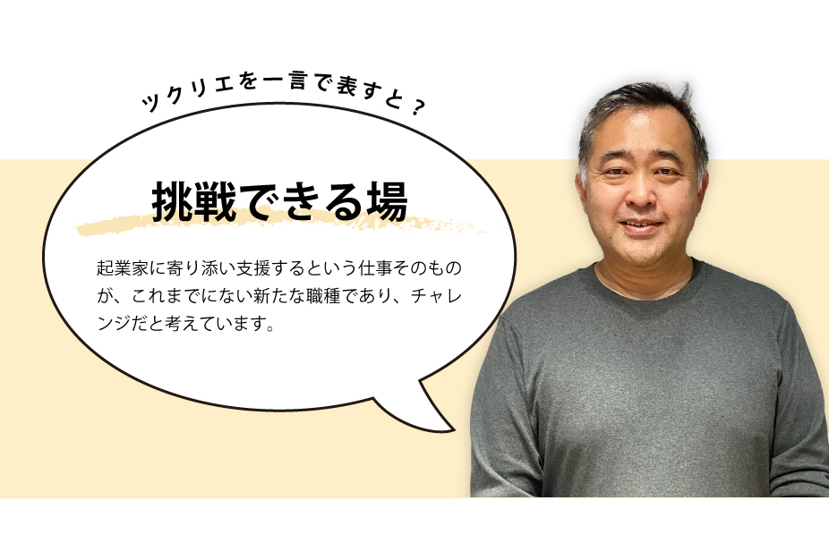 起業家に寄り添い支援するという仕事そのものが、これまでにない新たな職種であり、チャレンジだと考えています。その中で、新たな事業モデルやプラットフォームが誕生する予感を感じます。ツクリエは、そのような刺激的な環境のもと、新たな挑戦ができる場と考えています。