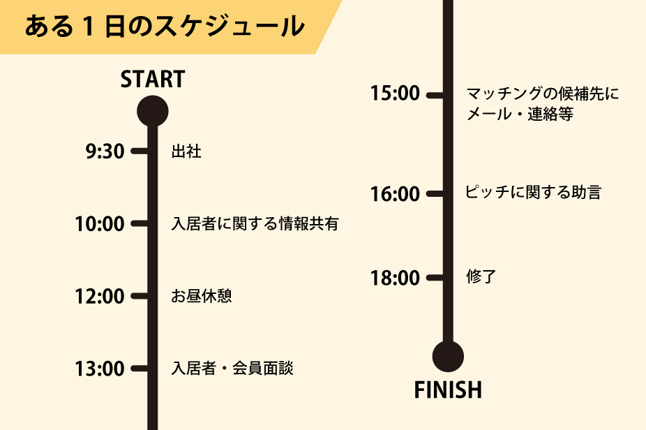ツクリエでは「インキュベーションマネージャー」といわれる職種を担当しています。一般的にいうと「メンタリング」のような役割で、創業支援施設において、入居者・会員が円滑に起業・成長・スケールアップできるよう助言(面談)しています。面談ではアイデアの壁打ち、法人設立に関わる手順、事業モデル・事業計画・資金調達に関する助言、マッチングなど幅広い内容を行っています。