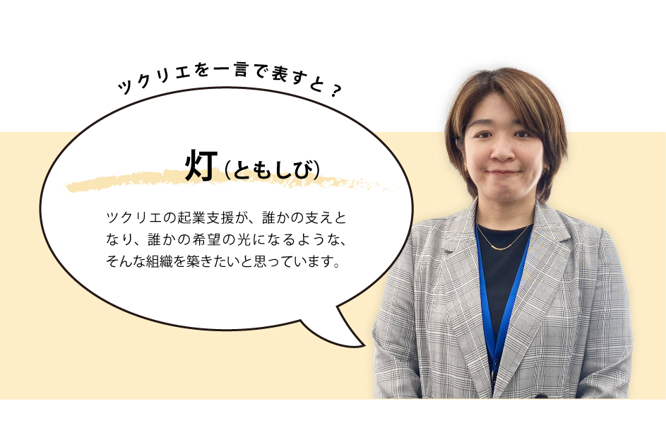 灯には、火が灯る明かりという意味だけでなく、「希望・意思」を象徴する明かりという意味もあります。 ツクリエの起業支援が、誰かの支えとなり、誰かの希望の光になるような、そんな組織を築きたいと思っています。その一員になりたい、という気持ちをもった方と一緒に働いていけたら嬉しいです。