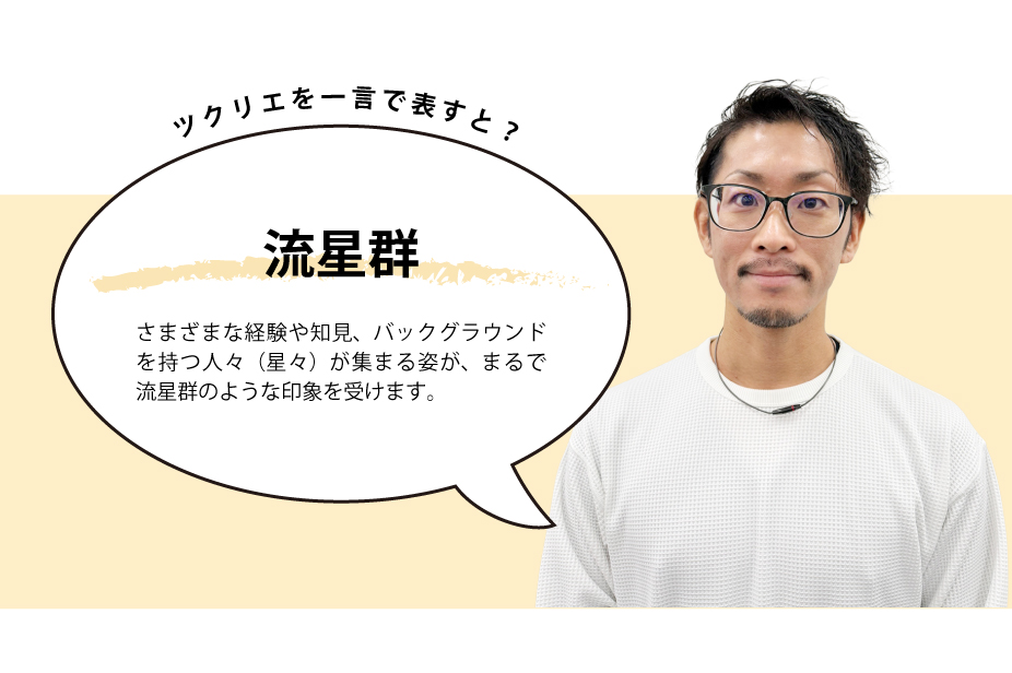 起業支援の場は、みんなが同じ軌道を高速で走り抜ける中、それぞれの大きさやスピード、個性が異なる多様な集合体のように感じます。さまざまな経験や知見、バックグラウンドを持つ人々(星々)が集まる姿が、まるで流星群のような印象を受けます。