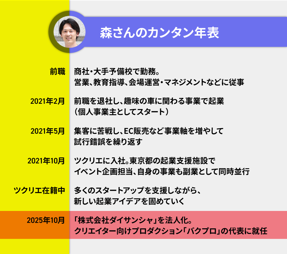 2021年、森さんは会社員という立場を離れ、起業しました。きっかけは趣味でもあった“車”。 「自由な働き方がしたい!」と動き出した起業は、準備期間ほぼゼロでのスタートでした。
