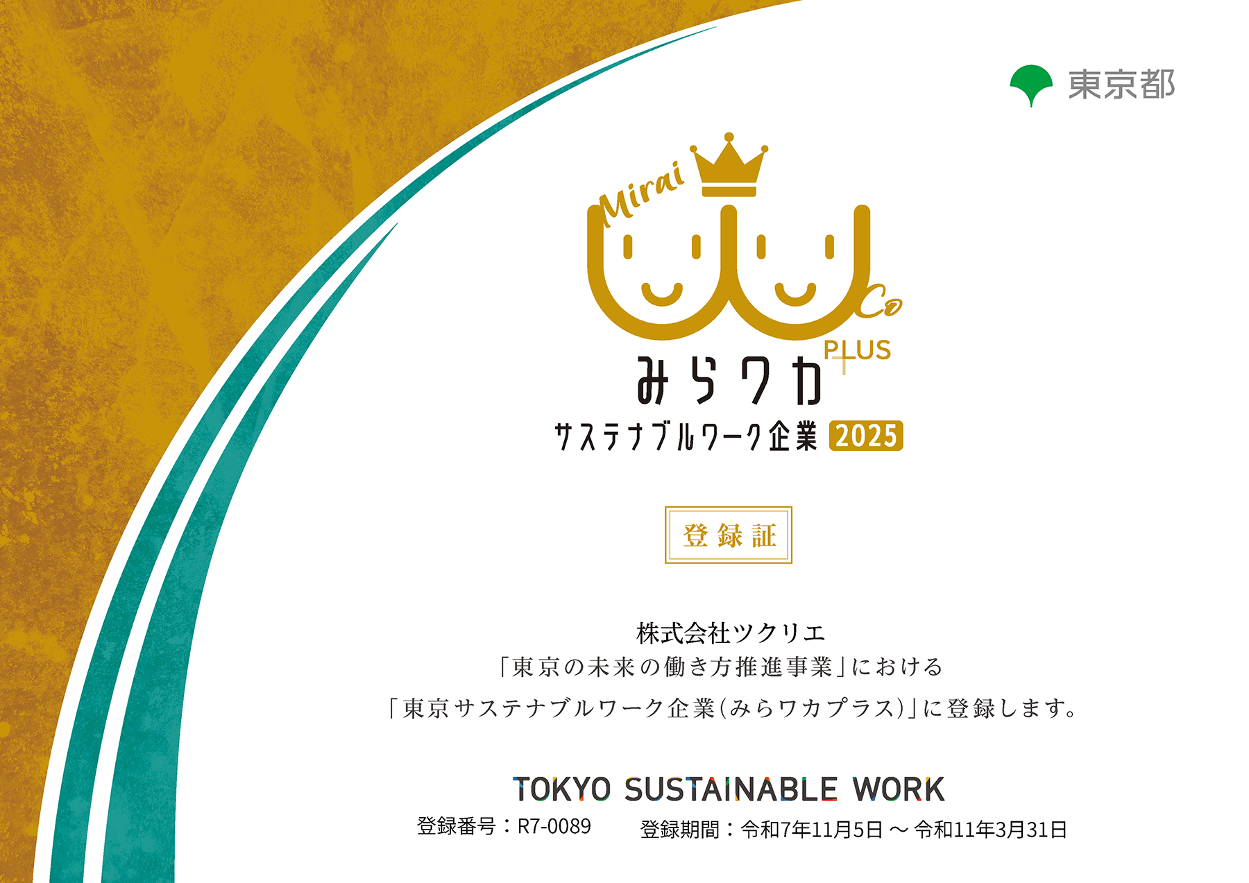 令和7年11月5日に、株式会社ツクリエは、「東京の未来の働き方推進事業」における「東京サステナブルワーク企業(みらワカ)」に登録しました。