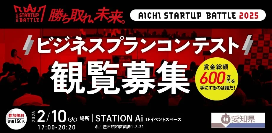 弊社が愛知県から運営受託しているアクセラレーション&賞金総額600万円のビジネスプランコンテストプログラム「Aichi Startup Battle 2025」のビジネスプランコンテストを、日本最大のスタートアップ支援拠点「STATION Ai」(名古屋市昭和区)にて、2026年2月10日(火)開催。観覧者を募集いたします。