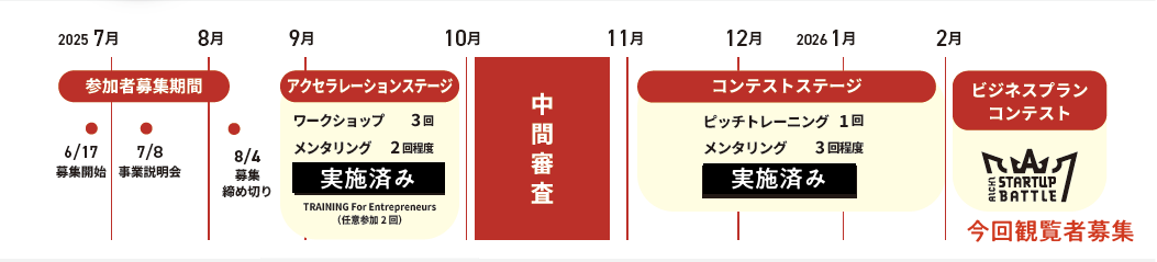 この度、本プログラムの中間審査選抜者が、投資、事業連携へ繋げることを目的に、外部の方に対してピッチを行う場として、2026年2月10日(火)にビジネスプランコンテストを開催します。つきましては、ビジネスプランコンテストの観覧者を募集しますのでお知らせします。